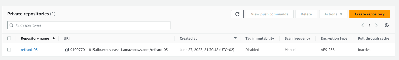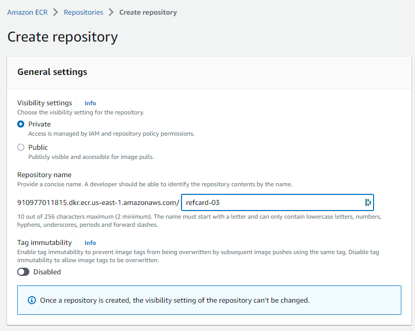 Die weiteren drei Variablen finden wir im neu erstellten Repository. Die Variablen und ihre Werte sind: "AWS_DEFAULT_REGION" = "us-east-1", "CI_AWS_ECR_REGISTRY" = "910977011815.dkr.ecr.us-east-1.amazonaws.com" und "CI_AWS_ECR_REPOSITORY_NAME" = "refcard-03".