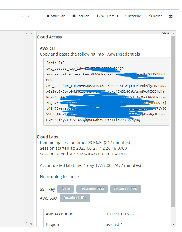 Um geheime Informationen für CI/CD nicht für jeden zugänglich zu machen, müssen wir Secret Variables erstellen. Die ersten drei finden wir im Learner Lab, wenn wir auf AWS-Details und dann auf AWS CLI klicken. Die Variablen heißen: "AWS_ACCESS_KEY_ID", "AWS_SECRET_ACCESS_KEY" und "AWS_SESSION_TOKEN".