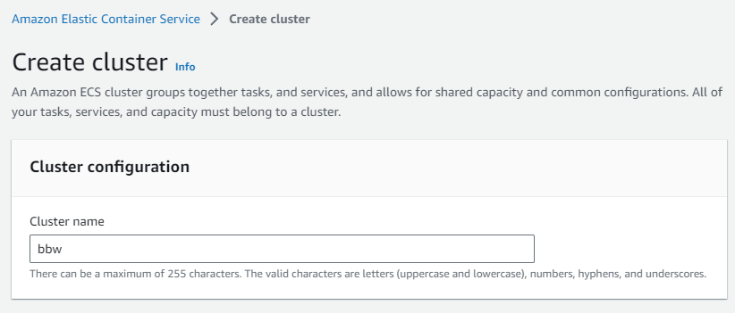 Anschließend beginnen wir mit der Erstellung eines ECS Clusters. Der Name spielt hierbei keine Rolle, wichtig ist nur, den Namespace zu entfernen, damit das Cluster im Learner Lab erstellt werden kann.