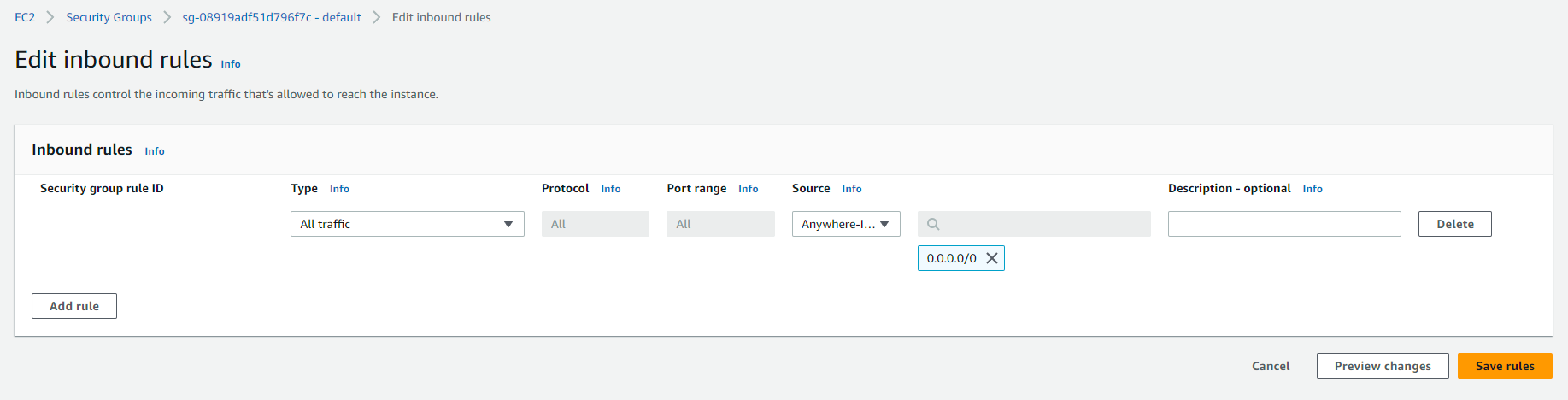 Aus Gründen der Schnelligkeit kann man in der Default Security Group festlegen, dass jeder eingehende Traffic zugelassen wird.