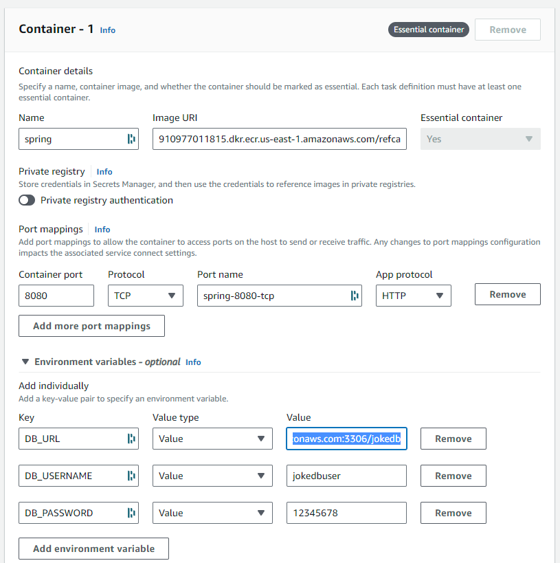 Nun erstellen wir eine Taskdefinition mit der Image-URL des Repositories (am Ende sollte :latest stehen). Der Port ist vom Image abhängig und die Environment-Variablen werden nur mit der RDS-Datenbank benötigt.